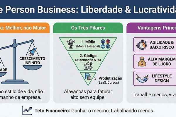 Descubra como o conceito de One Person Business une liberdade e alta lucratividade. Saiba por que troquei a busca pelo crescimento infinito por um…